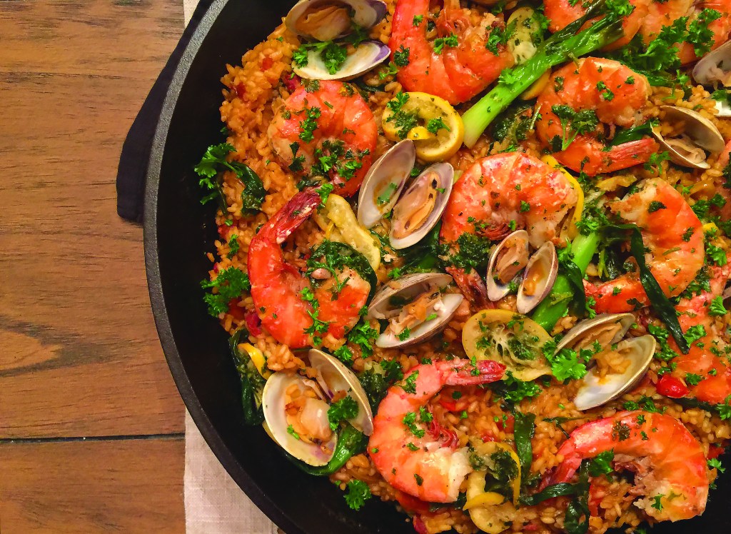 Paella is an awesome Spanish dish featuring bright flavors and fresh shellfish. It only takes about 40 minutes from start to finish. You’ll need a saucepan on a back burner to heat the stock with the saffron, and one large skillet to cook the paella. Saffron really gives this dish a fragrant pop of flavor and color, but if you absolutely must, just use paprika, it will still be delicious!